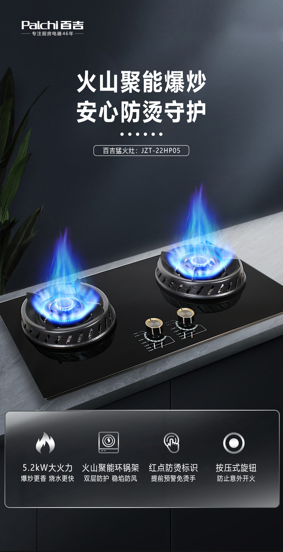 5.2kW聚能猛火灶,63%熱效率一級能效,帶熄火保護